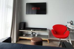 This air-conditioned apartment contains one bedroom with one bed and a private bathroom fitted with a walk-in shower and hairdryer. Guests can enjoy amenities such as a flat-screen TV with streaming services, wardrobe closet, work desk, iron, towels, bed linen, sofa seating area and hardwood flooring throughout.