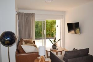 Inside the ground-floor apartment, guests will find one bedroom furnished with bed linen and towels supplied. The fully equipped kitchen includes an oven, stovetop, refrigerator, dishwasher, microwave, toaster, coffee machine and electric kettle alongside a dining table to enjoy meals comfortably. Additional room amenities comprise heating and air conditioning units, hardwood/parquet flooring combined with carpeted areas in some sections as well as an iron and clothes drying rack.