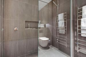 Guests benefit from access to two bathrooms fitted with showers and complimentary toiletries including shampoo and conditioner. The accommodation also features practical amenities such as a washing machine, wardrobe space, bedside sockets for charging devices as well as smoke detectors for safety. Lift access leads directly to the unit which has its own private entrance.