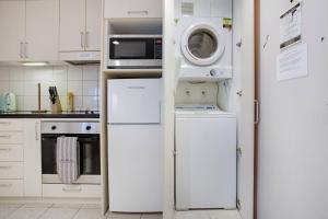Inside the apartment, guests will find a well-equipped kitchen featuring an oven, stovetop, refrigerator, dishwasher, microwave, toaster, electric kettle as well as kitchenware for convenient dining experiences. The unit also includes one bedroom complete with air conditioning and heating along with amenities such as an iron, wardrobe closet, seating area including a sofa, carpeted floors and a washing machine complemented by a clothes drying rack.