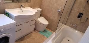 The accommodation consists of two bedrooms and a living room with four beds in total. Guests enjoy an equipped kitchen featuring a stovetop, oven, dishwasher, microwave, coffee machine, electric kettle, toaster and full kitchenware set. Two bathrooms include walk-in showers and bathtubs along with slippers, complimentary toiletries such as shampoo and conditioner, body soap and a hairdryer. Additional room amenities comprise air conditioning, hardwood flooring, ironing facilities including iron and board, a work desk as well as sofa seating.