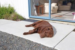 The accommodation featured a clean, modern design with spacious rooms and a comfortable bed. Fresh breakfast items such as muesli, Greek yoghurt, eggs, and bread were provided. The property was well-equipped for families, including a cot and plenty of towels. A peaceful deck offered relaxation while the pet-friendly environment welcomed guests with a friendly dog. Attention to detail included fresh oranges from the tree left in the room.
