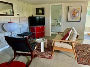 Guests can enjoy kitchen facilities such as a toaster, refrigerator, microwave coffee machine as well as tea and coffee making supplies including an electric kettle. Additional conveniences include flat-screen TV with streaming services like Netflix along with bedside sockets for charging devices. On-site parking is available along with luggage storage options while the ground floor unit offers easy access to the garden view patio furnished for comfort.