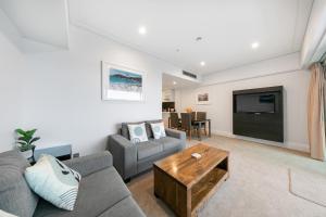 The accommodation comprises one bedroom with one bed and an adjoining living room fitted with a flat-screen TV featuring streaming services. The fully equipped kitchen includes an oven, stovetop, dishwasher, refrigerator, microwave, toaster, electric kettle as well as tea and coffee making facilities. The bathroom offers a bathtub or shower along with complimentary toiletries such as shampoo and conditioner.
