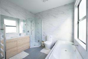 Located just 2.8 km from Milford Beach, Wanna Live In The Brand New House? Check This Out! is a spacious holiday home in Auckland featuring a garden and air conditioning. This single-room property offers three beds and stunning garden views.